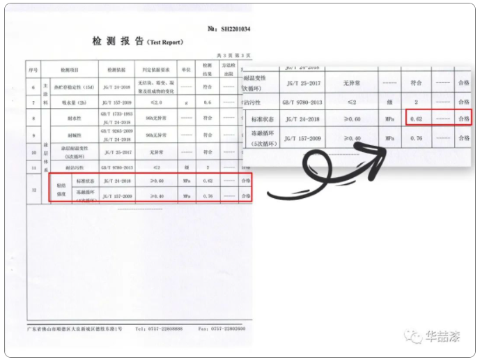 華喆天然真石漆施工后十分堅(jiān)固,附著力強(qiáng),其粘結(jié)強(qiáng)度測試結(jié)果為0.62MPA,符合國家標(biāo)準(zhǔn)粘結(jié)強(qiáng)度≥0.6MPA。